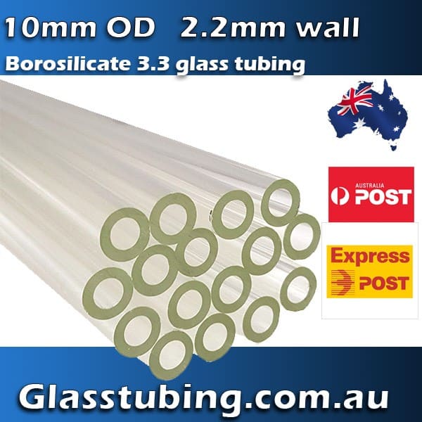 High-quality borosilicate 3.3 clear glass tubing OD 10mm Thickness 2.2mm. These tubes are 2.2mm thick with a 10mm outside diameter (OD) and 750mm long making them strong and durable. However, they are harder to heat up and mold. These tubes are better for more experienced glass blowers.